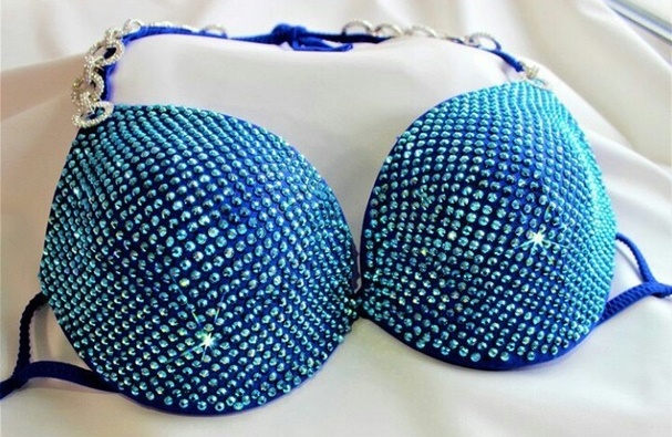 Купальник по верхней линии украшен голубыми пришивными стразами, в россыпи купальника использованы стразы 4х оттенков