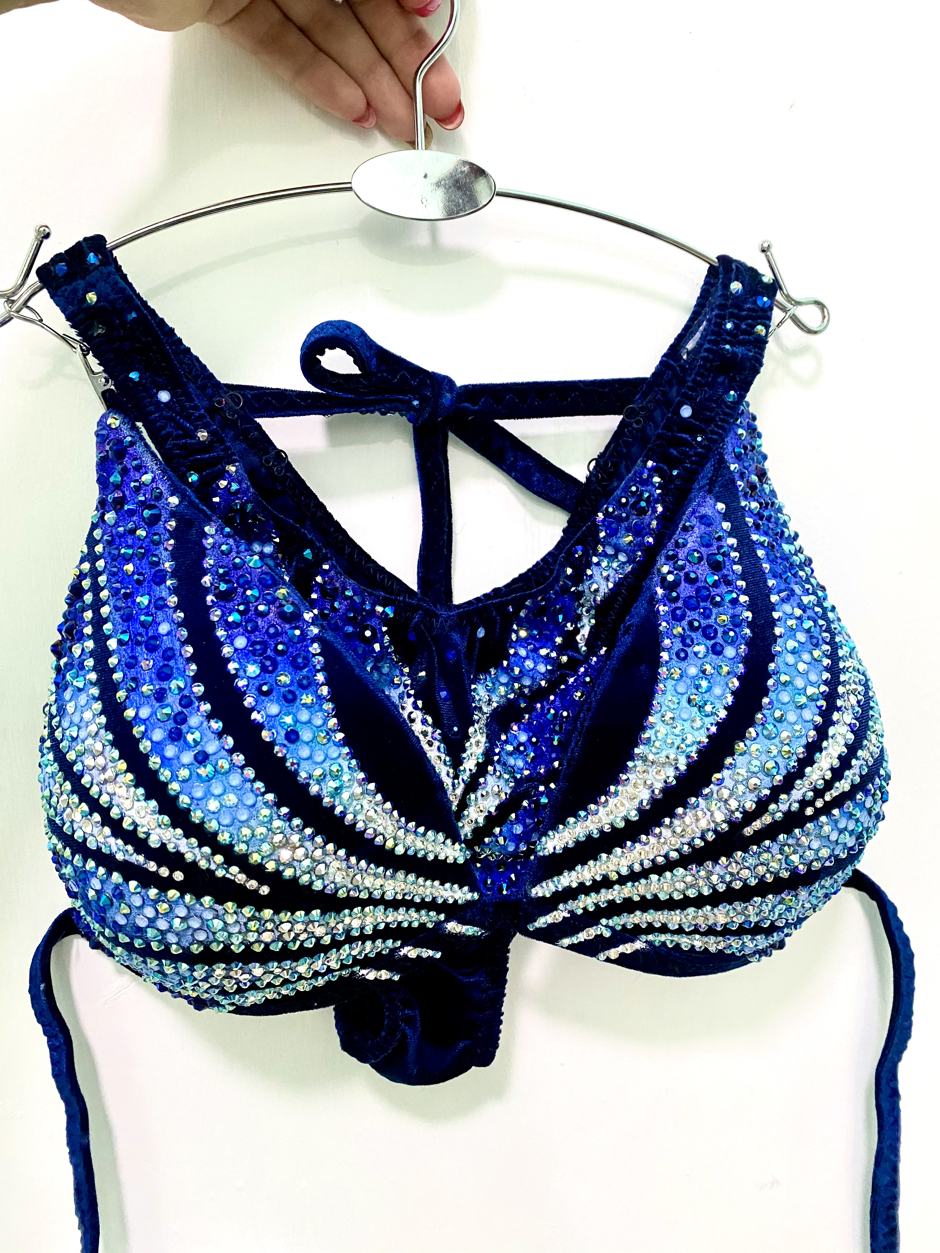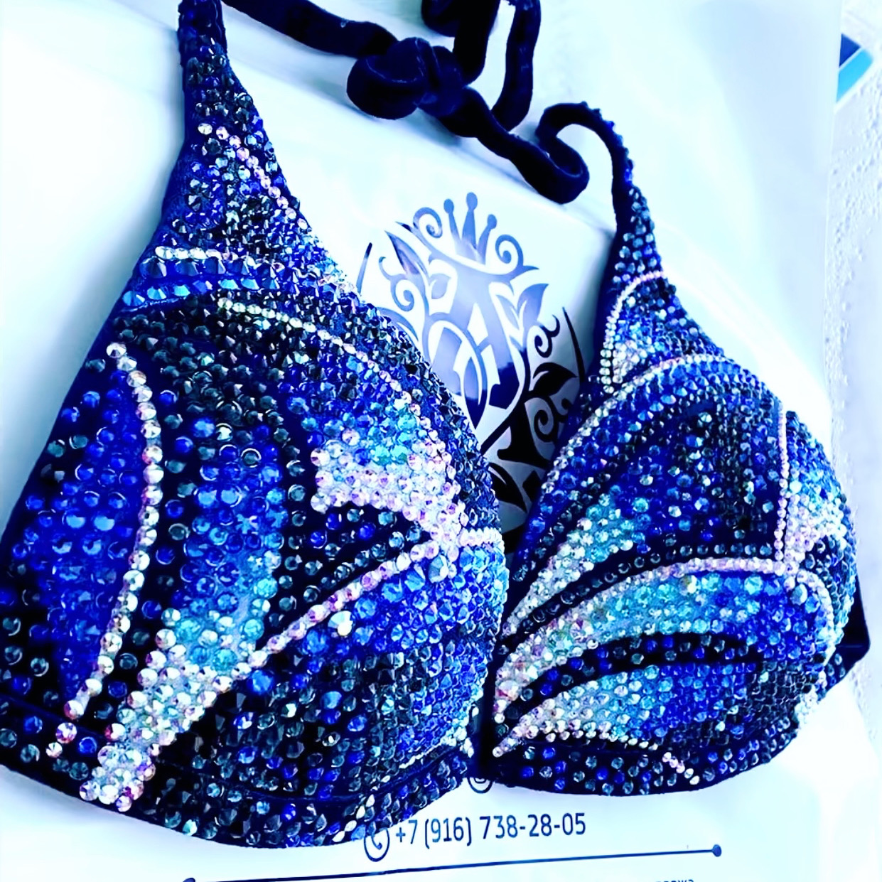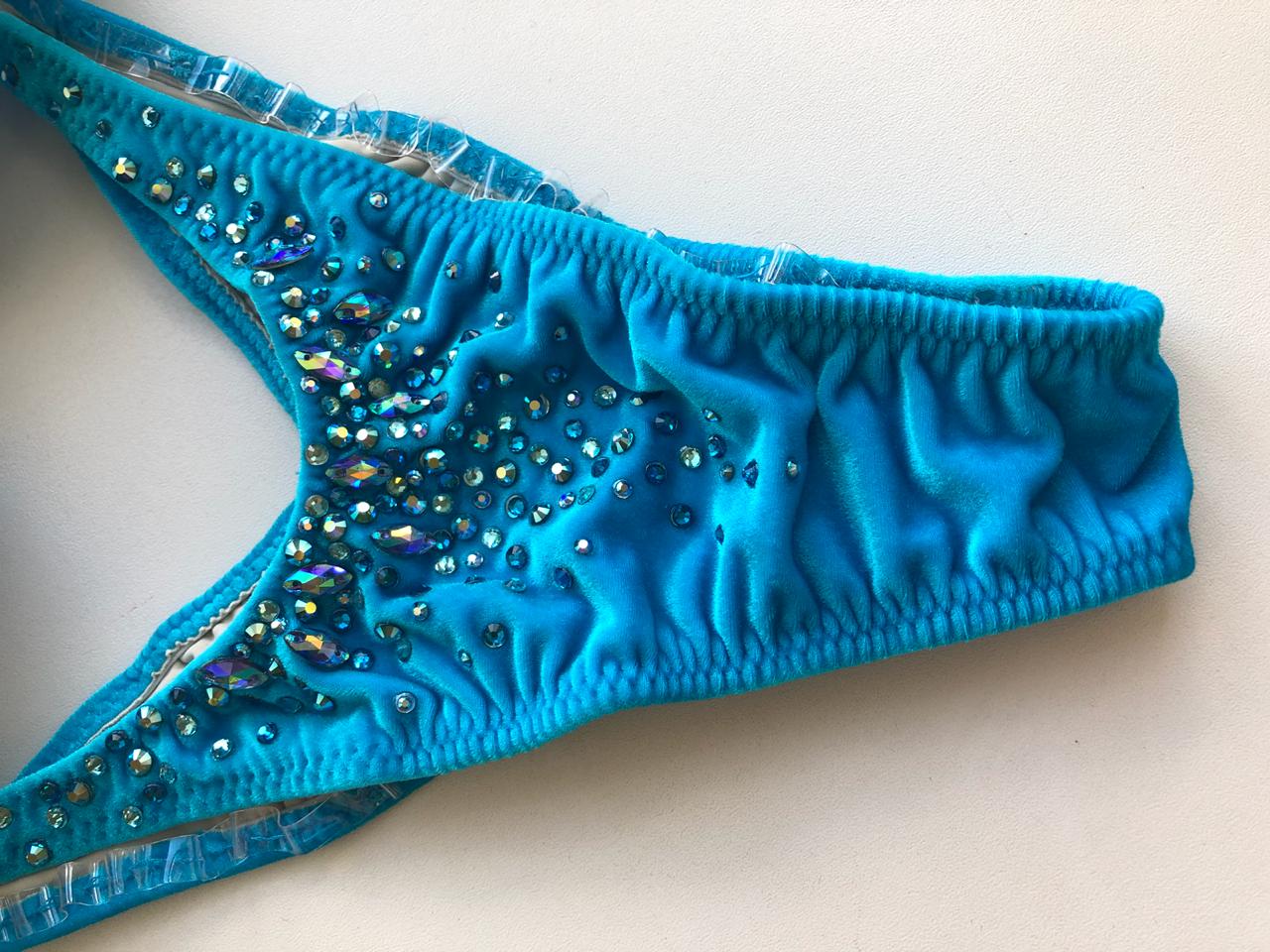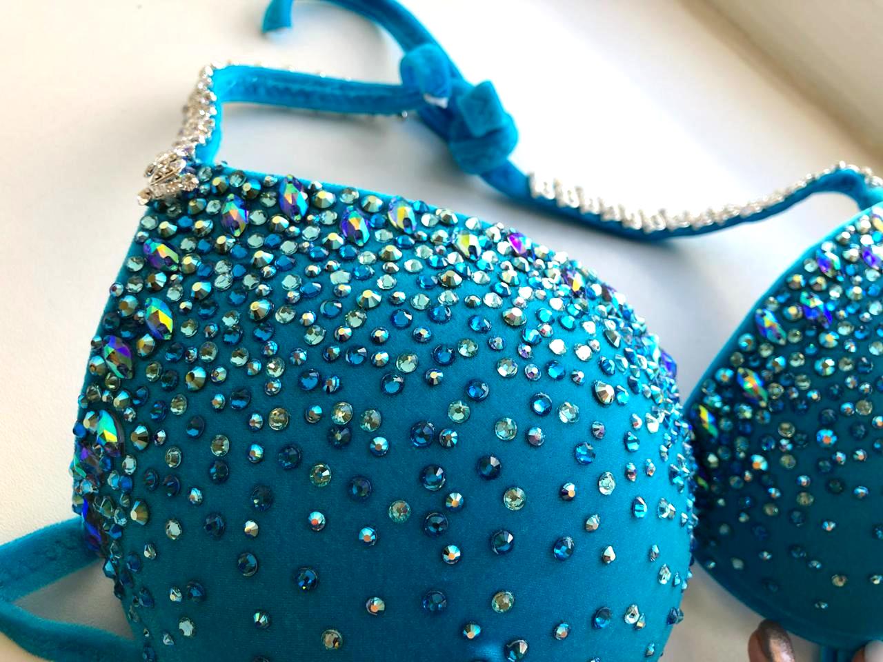 Купальник по верхней линии украшен голубыми пришивными стразами, в россыпи купальника использованы стразы 4х оттенков