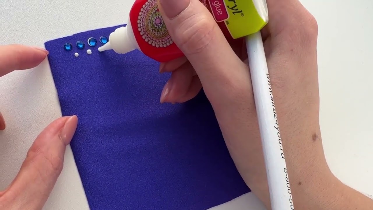 We practice the correct size of the glue drop on 2 pieces of fabric with practice rhinestones